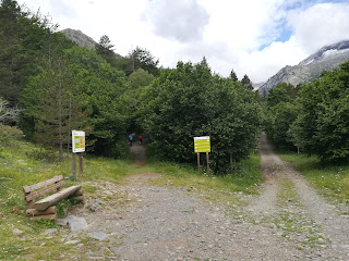 | el parking del Valle de Estos. Vemos a la entrada del parking un poste indicador señalizando la dirección del refugio de Estós que seguimos |